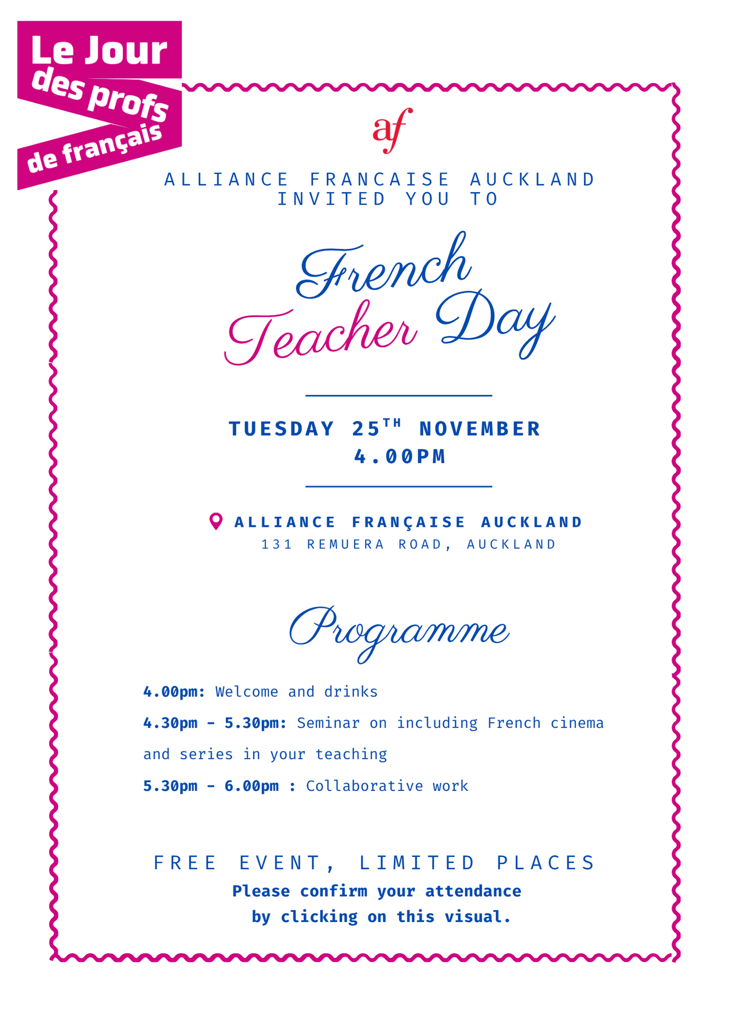 The Alliance Française Auckland (AFA) are celebrating La Journée des profs de français at the AFA on Tuesday the 25th November from 4pm to 6pm at 131 Remuera RD, Auckland. After a welcome drink, we will run a session on "how to include French cinema and series in your teaching.
